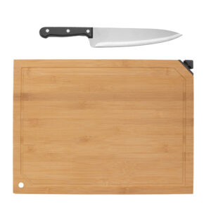 Tamaño 40 x 30 x 1.2 cm. Bambú. Set de corte. Tabla de Bambú con afilador incorporado y cuchillo. Cuchillo de acero inoxidable con mango en madera color negro de 32.5 cm . Afilador de plástico y acero de 5 x 2,4 x 1,2 cm. Presentación en caja de regalo. |